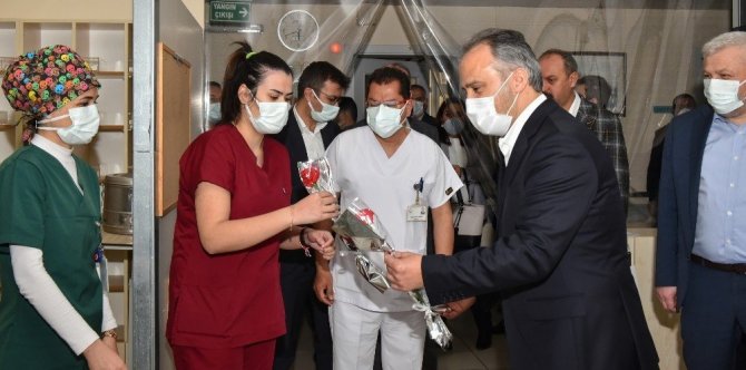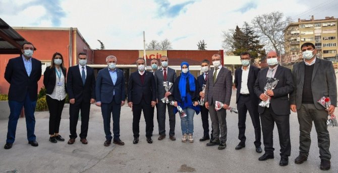 Çekirge Devlet Hastanesi'ni ziyaret eden Bursa Büyükşehir Belediye Başkanı Alinur Aktaş, İl Sağlık Müdürü Dr. Fevzi Yavuzyılmaz ve hastane yönetimiyle birlikte görev yapan doktorları görevleri başında ziyaret edip, çiçek takdim ederek 14 Mart Tıp Bayramını kutladı. Başkan Aktaş, Türkiye'nin ve dünyanın bir yıldır içinde bulunduğu sürecin özellikle sağlık çalışanlarını çok ciddi etkilediğini söyledi. Türkiye'de yapılan sağlık yatırımlarının yanında sağlık çalışanlarının özel gayretleriyle sürecin en az hasarla atlatıldığını hatırlatan Başkan Aktaş, "Pandeminin en fazla hissedildiği Kasım-Aralık aylarında ve şu anda nasıl canla başla çalıştıklarını bizzat görüyoruz. Sağlık çalışanlarına teşekkür etmek için ne yapsak azdır. 14 Mart Tıp Bayramı'nı vesile kılarak sağlık çalışanlarına teşekkür etmek istedik. Tüm sağlık çalışanlarının Tıp Bayramı kutlu olsun" dedi.