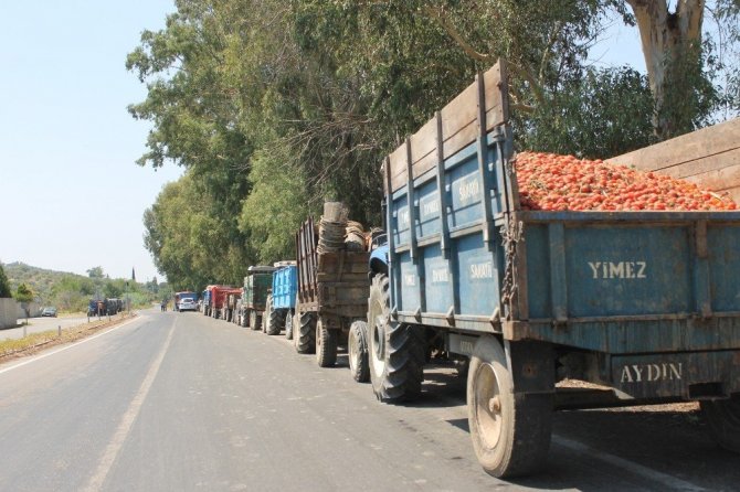 Aydın’ın Efeler ilçesinde domates sezonu hareketliliği devam ederken, domateslerini hasat eden üreticiler, salça fabrikası önünde uzun kuyruk oluşturdu.