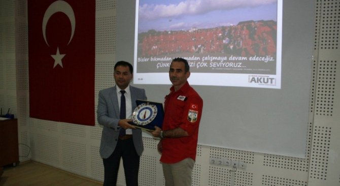 Etkinliğin sonunda, katkılarından dolayı AKUT Yönetim Kurulu Başkanı Recep Şalcı’ya Meslek Yüksekokulu Müdürü Mehmet Erdem tarafından Teşekkür Belgesi, Rektör Yardımcısı Mustafa Aydın tarafından seramik tabak takdim edildi..