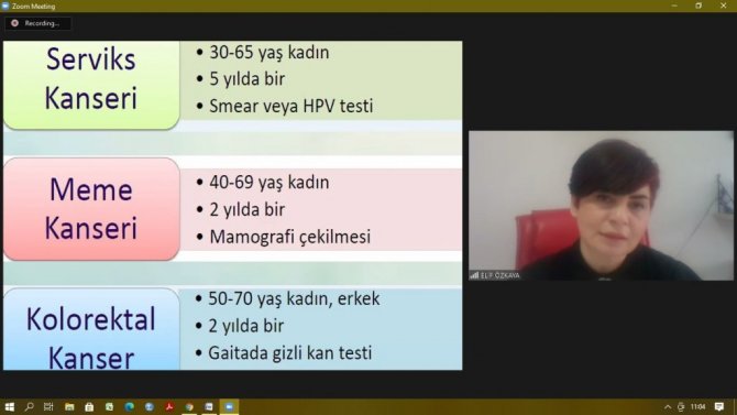 Dr. Elif Özkaya özellikle kanser tarama programında olan serviks (rahim ağzı) kanseri, meme kanseri ve kolorektal (kalın bağırsakla ilgili) kanseri üzerinden durarak, "Meme kanseri için 20-40 yaş arası kadınların her ay meme muayenesi ve 2 yılda bir klinik meme muayenesi yaptırmaları çok önemli. 40-69 yaş arası kadınların ise her ay meme muayenesi, yılda bir klinik meme muayenesi olup 2 yılda bir de mamografi çektirmeleri gerekiyor" diye konuştu.