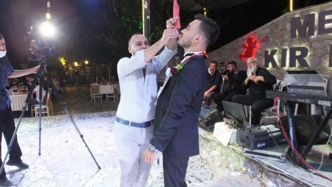 Bu arada damat Ömer Önder için takı sırasına giren arkadaşları da damada zorla çikolata yedirdi. Bir arkadaşı da para ve altın yerine patlıcan taktı.