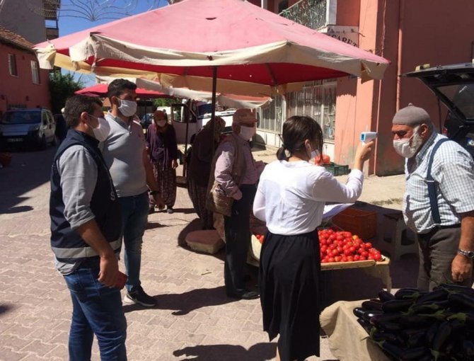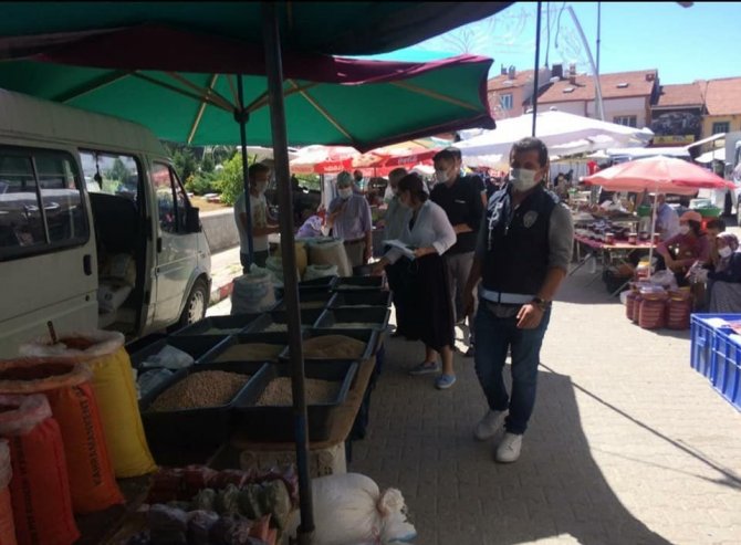 Kütahya’nın Dumlupınar ilçesinde haftada bir kez açılan pazarda İlçe Emniyet Amirliği, Belediye Zabıtası, İlçe Tarım ve Orman Müdürlüğü ve sağlık ekiplerince pazaryeri esnafı temizlik maske ve mesafe kurallarına uyulup uyulmadığının kontrolü yapıldı.
