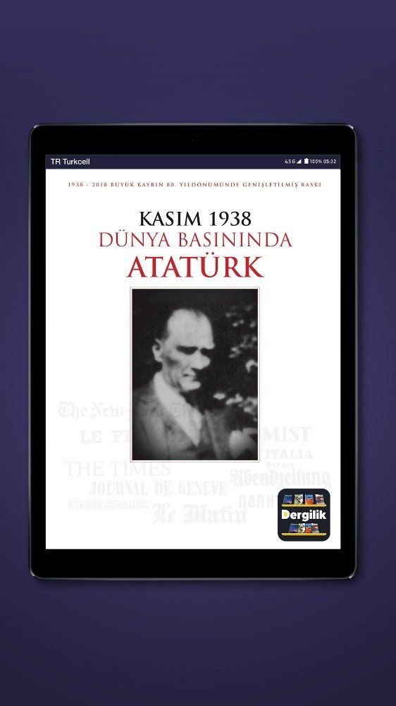 Turkcell’in dijital yayın platformu Dergilik, Mustafa Kemal Atatürk’ün vefatının 80’inci yıldönümünde, çok özel bir eseri okuyucularıyla buluşturacak. Türkiye’de televizyon gazeteciliğinin önde gelen isimlerinden Nuri Çolakoğlu’nun hazırladığı ‘Kasım 1938-Dünya Basınında Atatürk’ adlı kitabı tüm Dergilik abonelerine ücretsiz olarak sunulacak.