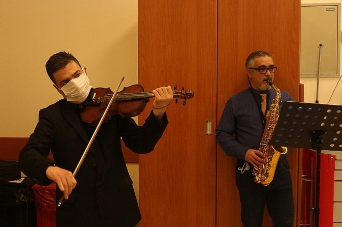 Ferit Ginol Kültür ve Sanat Merkezi'nin katkılarıyla düzenlenen müzik dinletisiyle moral bulan hastalara, Prof. Dr. Yıldırım tarafından karanfil takdim edildi.