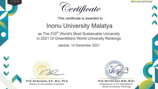 Malatya İnönü Üniversitesi Green Metric Değerlendirme Kuruluşunun yapmış olduğu 2021 Yeşil Kampüs Dünya sıralamasında bir sene içerisinde 30 basamak yükselerek 310'uncu sırada yerleşti. İnönü Üniversitesi'nin bundan sonraki hedefinin daha yüksekler olduğu vurgulandı.