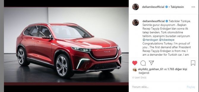 Verdiği konser nedeniyle birkaç gün önce Eskişehir’de de bulunan Della Miles, dün Cumhurbaşkanı Recep Tayyip Erdoğan tarafından tanıtımı yapılan yerli otomobille ilgili sosyal medya hesabı üzerinden bir paylaşım yaptı. Türkiye’ye yerleştikten sonra Müslüman olan ABD’li şarkıcı Della Miles, İngilizce ve Türkçe olarak yaptığı paylaşımda yerli otomobil için Türkiye’yi tebrik ederek kendi siparişini de verdi. Della Miles otomobilden bir fotoğraf paylaşarak, “Tebrikler Türkiye. Seninle gurur duyuyorum. Başkan Recep Tayyip Erdoğan’dan sonra ilk talep benden, Türk otomobiline talibim, siparişimi buradan veriyorum” diye yazdı.