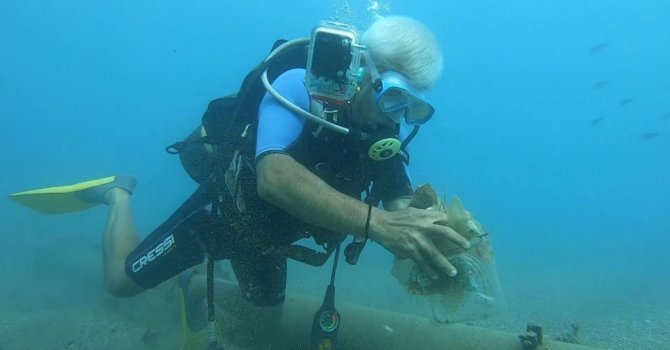 Akdeniz Üniversitesi(AÜ) Su Ürünleri Fakültesi Öğretim Üyesi Prof. Dr. Mehmet Gökoğlu, dünyaca ünlü Konyaaltı Sahili'ne yaptığı 10 dakikalık dalışta, çoğunluğu plastik maddeden oluşan iki torba çöp çıkardı.
