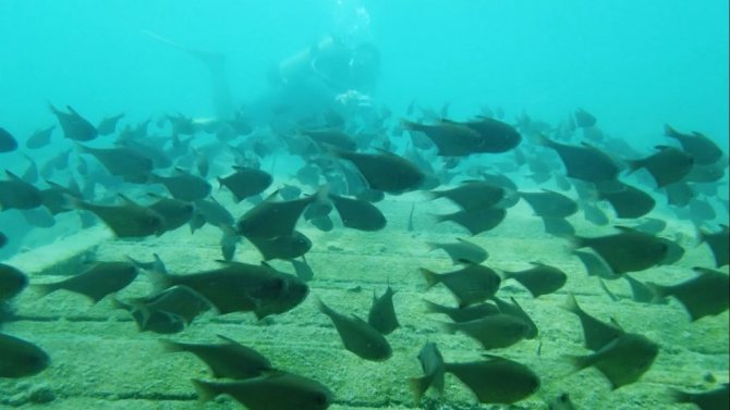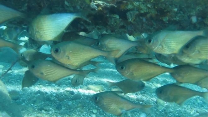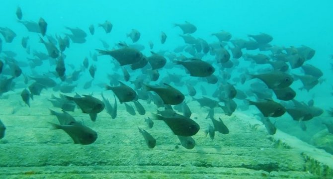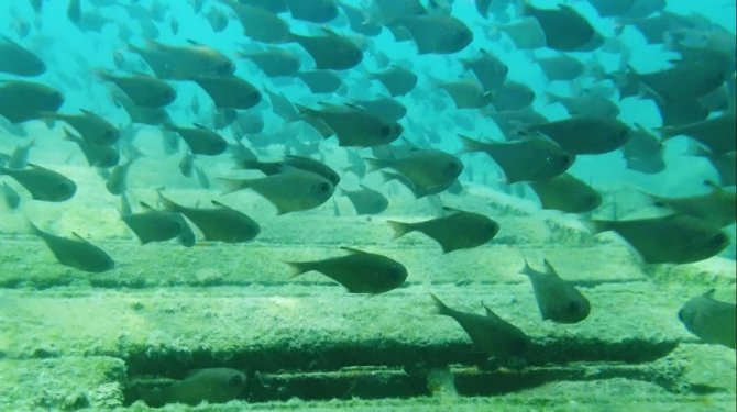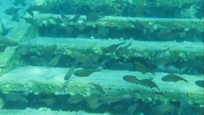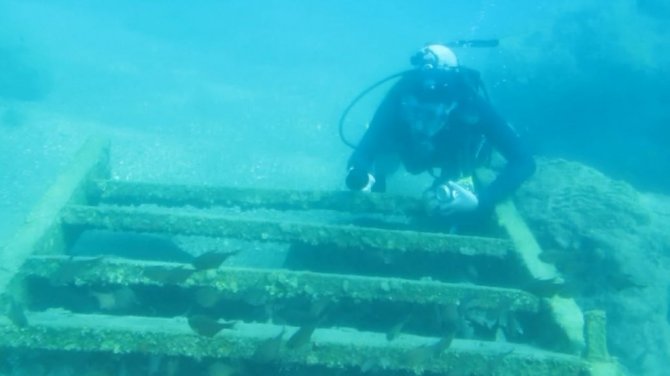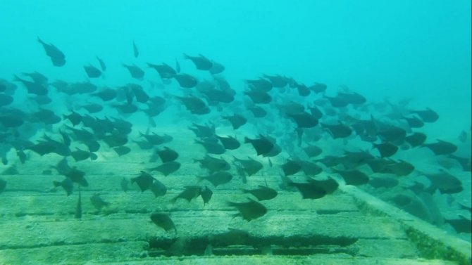 Su altında çok güzel bir görüntünün kameralarına yansıdığını dile getiren Gökoğlu, "Pempheris, yani mağara ya da üçgen balıklar olarak adlandırılan balıkları görüntüledik. Denizin içinde bir merdiveni resif olarak kullanıyorlardı. Çok güzel görüntülerdi ve resiften ayrılmıyorlardı. Bu balıklar genelde karanlık fazla ışık almayan loş ortamlarda yaşarlar. Kolay kolay aydınlık yere çıkmazlar. Merdivenin aralarından zaman zaman dışarı çıkıp bize, görsel şölen sundular. Sanki akvaryumu andırıyordu" diye konuştu.