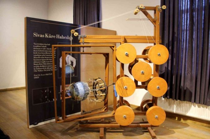 Sivas'ta yaşayan Botanikçi Profesör Yener Okatan'ın 2000'li yıllarda bulduğu ve patentini aldığı dünyanın ilk Küre Halı dokuma tezgahı, Sanayi Mektebi müzesinde sergileniyor.