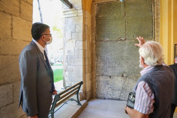 Çini Müzesi'nin girişindeki kitabeyi de inceleyen Vali Ali Çelik, son Germiyan Beyi İkinci Yakup Çelebi'ye ait olan taş kitabenin Osmanlı Türkçesiyle yazılmış dünyanın en büyük ikinci taş kitabesi olduğunu söyledi.