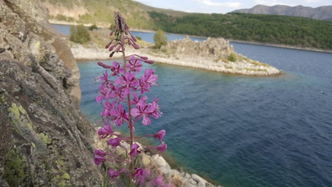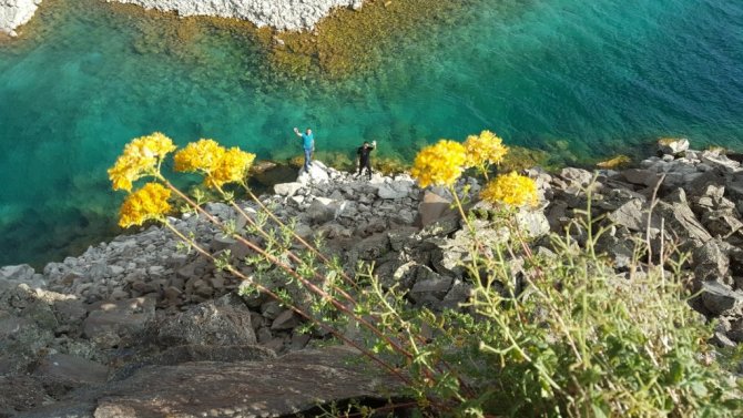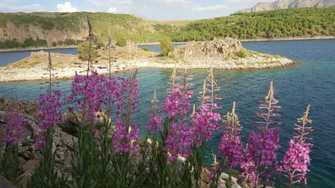 Bitlis'in Tatvan ilçesinde bulunan ve dünyanın ikinci büyük krater gölü olan Nemrut Krater Gölü çevresinde açan rengarenk çiçekler ziyaretçilerini adeta mest ediyor.