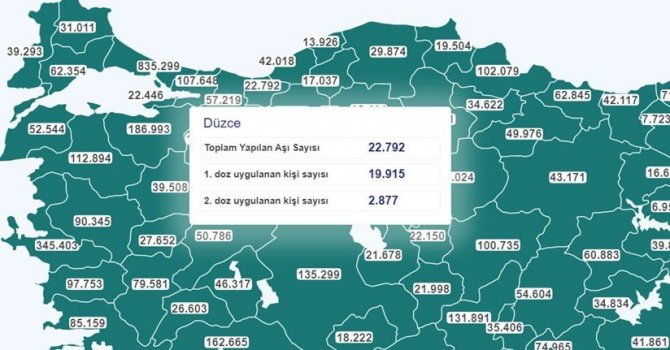 Aşı uygulamasının başladığı 25 Ocak'tan bu zamana kadar Düzce'de toplam 19 bin 915 kişiye 1. doz Covid-19 aşısı yapıldı. Düzce'de ayrıca 2 bin 877 kişiye de 2. doz Covid-19 aşısı yapıldı. İl genelinde toplamda 22 bin 792 kişiye Covid-19 aşısı uygulandı. Aşılama süreci kademeli olarak devam ediyor.