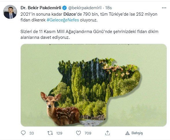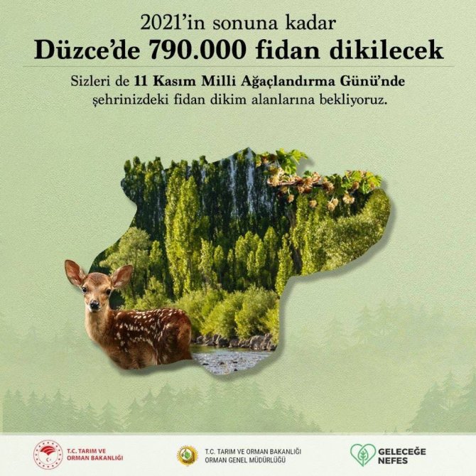 Ülke genelinde çıkan orman yangınları sonrasında Tarım ve Orman Bakanlığı, Türkiye'nin 81 ilinde fidan dikim etkinliğinde bu yıl milyonlarca fidan dikileceğini açıkladı. Tarım ve Orman Bakanı Dr. Bekir Pakdemirli, sosyal medya hesabından paylaştığı Düzce haritası ile Düzce'de 2021 yılı sonuna kadar 790 bin fidanı toprakla buluşturacaklarını açıkladı. Pakdemirli, " 2021'in sonuna kadar Düzce'de 790 bin, tüm Türkiye'de ise 252 milyon fidan dikerek geleceğe nefes oluyoruz. Sizleri de 11 Kasım Milli Ağaçlandırma Günü'nde şehrinizdeki fidan dikim alanlarına davet ediyoruz" yazarak sosyal medya hesabından paylaştı.
