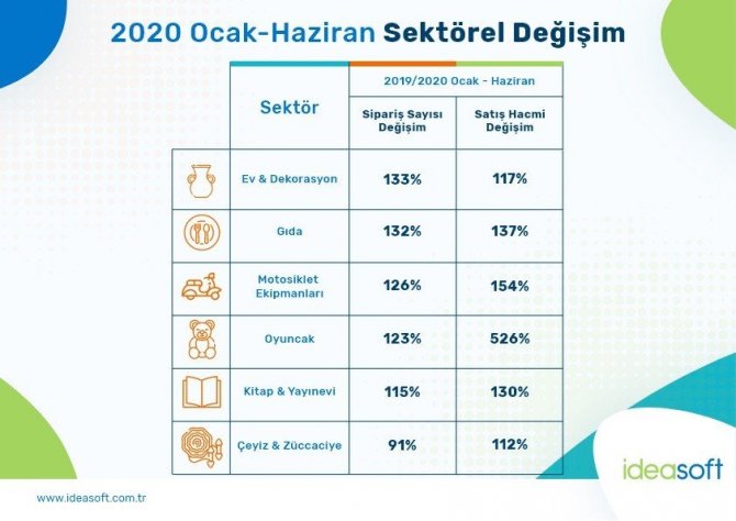 Verilere göre, oyuncak siparişleri 6 ayda yüzde 123 artarken sektörün satış hacmi de 2019 yılının aynı dönemine oranla yüzde 526 büyüdü. Oyun ve hobi ürünlerinde kaydedilen yüzde 274’lük sipariş artışı ise sektörün satış hacmini yüzde 172 oranında artırdı. Aynı dönemde; motosiklet ekipmanları satış hacmindeki yüzde 154’lük artışla öne çıkarken onu yüzde 136 ile müzik ve müzik aletleri ve yüzde 130 ile kitap ve yayınevi sektörü izledi.