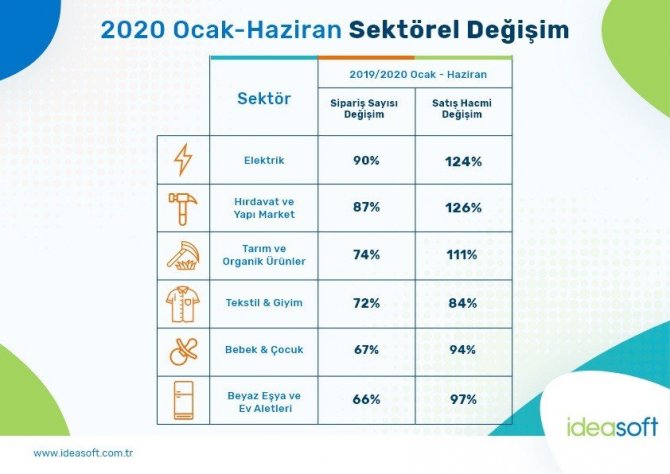 Online alışveriş, temel ihtiyaçların temininde de tüketicilerin tercihi oldu. Salgın sürecindeki bulaş riski nedeniyle pazar ve market gibi kalabalık alanlardan kaçınan vatandaşlar internetten sipariş vermeye başladı. Verilere göre; 2020’nin ilk yarısında bir önceki yılın aynı dönemine kıyasla iç giyim sektöründe yüzde 160, gıdada yüzde 132, tarım ve organik ürünlerde yüzde 74, tekstil ve giyimde yüzde 72, bebek ve çocuk ürünlerinde yüzde 67, ayakkabıda yüzde 52 ve temizlik ürünlerinde yüzde 31’lik sipariş artışı kaydedildi. Öte yandan, tüketicilerin bir kısmı çocuklarıyla geçireceği vakti keyifli hale getirecek ürünler, bir kısmı da kişisel gelişimine katkı sağlayacak aktiviteler aradı.