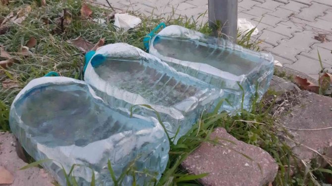Kış mevsimi nedeniyle yiyecek ve içecek bulmakta zorluk çeken sokak hayvanları için yol kenarlarına bırakılan su dolu kapların da buz tuttuğu görüldü.