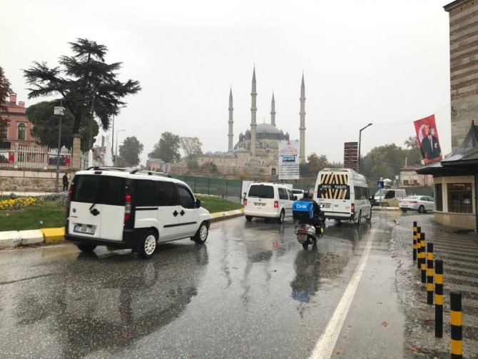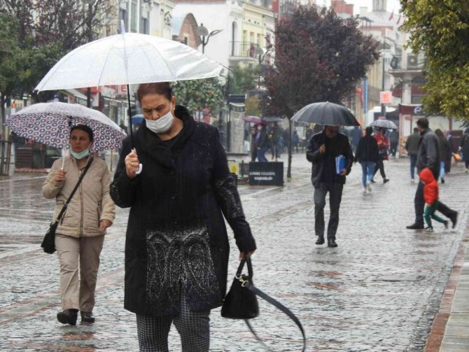 Edirne'de hafif şekilde başlayan ve etkisini arttıran yağmur yer yer etkili olurken, yağmura hazırlıksız yakalananlar sığınacak yer aradı.