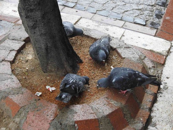Öte yandan, çarşı esnafı ağaçların altına güvercinler için yem bıraktı. Yağmurda yiyecek bulmakta zorlanan güvercinler esnafın bıraktığı yemlerle karnını doyurdu.