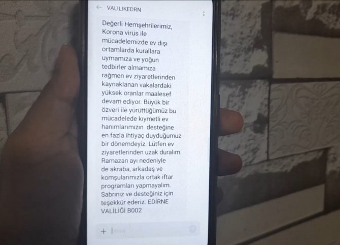 Öte yandan, Edirne'de korona virüs vakalarının yüzde 60'ının ev kadınlarından oluştuğu öğrenildi. Edirne Valiliği tarafından Edirnelilere gönderilen kısa mesajda, ev ziyaretlerinden kaynaklanan vakalardaki yüksek oranın devam ettiği belirtildi. Korona virüsle mücadelede ev hanımlarının desteğine en fazla ihtiyaç duyulduğu belirtilen mesajda, ev ziyaretlerinden ve iftar programlarından uzak durulması çağrısında bulunuldu.