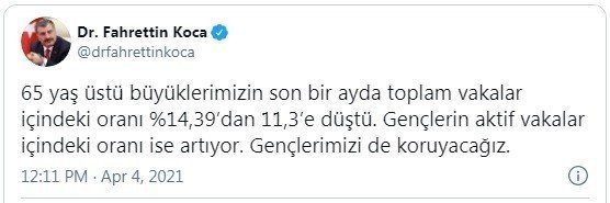 Sağlık Bakanı Fahrettin Koca, sosyal medya hesaplarından yaptığı paylaşımda, 65 yaş üstü vatandaşların vaka oranının düştüğünü ancak gençlerin vaka oranının arttığını belirterek, "65 yaş üstü büyüklerimizin son bir ayda toplam vakalar içindeki oranı yüzde 14,39'dan 11,3'e düştü. Gençlerin aktif vakalar içindeki oranı ise artıyor. Gençlerimizi de koruyacağız" demişti. Bakan Koca'nın bu paylaşımı Edirne'de görüntülere yansıdı. Edirne Sultan 1. Murat Devlet Hastanesine Covid-19 testi yaptırmak için başvuran kişilerin çoğunun gençlerden oluştuğu görüldü. 20'li yaşlardaki gençlerin test yaptırmak için sırada beklediği de kameralara yansıdı.