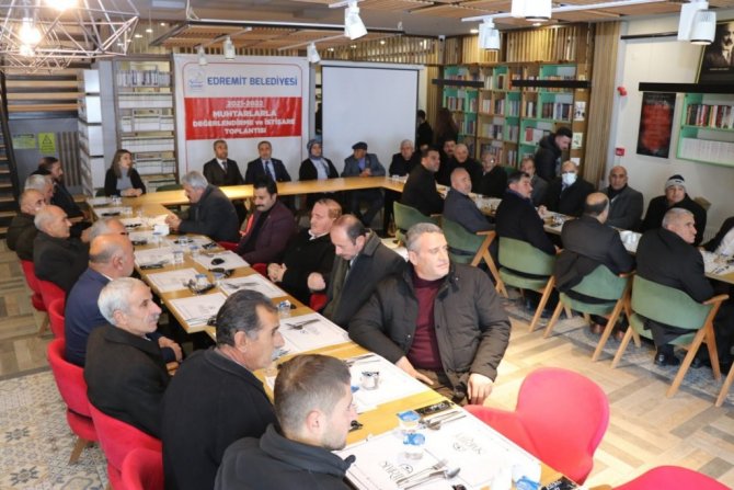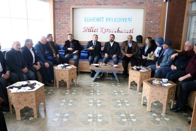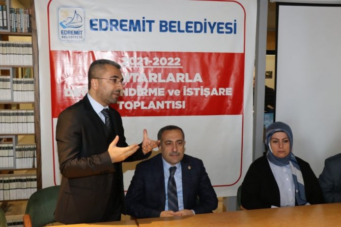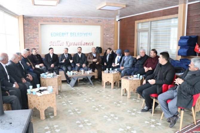 Edremit Belediyesi'ne ait Millet Kıraathanesi'nde gerçekleştirilen toplantıya, AK Parti Van Milletvekili Abdulahat Arvas, Edremit Belediye Başkanı İsmail Say, AK Parti Edremit İlçe Başkanı Sezer Bayramoğlu, belediye meclis üyeleri ve mahalle muhtarları katıldı. Başkan İsmail Say'ın selamlama konuşması ile başlayan toplantı akabinde Edremit Belediyesi'nin yapmış olduğu hizmetlerin yer aldığı slayt sunumun izlenmesi ile devam etti. Daha sonra muhtarlara söz veren Başkan Say, talepleri Milletvekili Arvas ile birlikte değerlendirdi. Mahalle muhtarlarının yapılmasını istedikleri hizmetlere dair talep ve önerilerini dile getirdikleri toplantıda, ayrıca mahallelerde yapılacak yeni çalışmalar hakkında da karşılıklı istişarelerde bulunuldu.