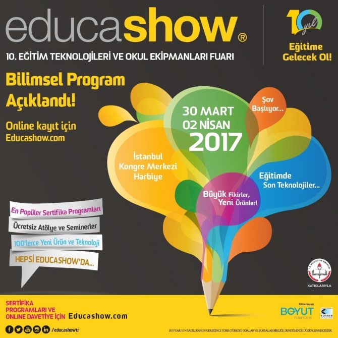 30 Mart - 2 Nisan tarihleri arasında Harbiye İstanbul Kongre Merkezinde gerçekleşecek olan, Boyut Group’un düzenlediği ve Milli Eğitim Bakanlığının desteklediği Educashow Fuarı kapsamında, yüzlerce yeni ürünün tanıtımı, Türkiye’nin önemli eğitim uzmanlarının seminerleri ve ücretsiz öğretmen eğitimi programları düzenlenecek. Educashow, 11.00-18.00 saatleri arasında eğitimcileri ve teknoloji meraklılarını ağırlayacak.