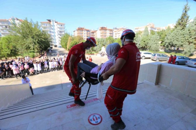 Eğitimin ardından sirenlerin çalması ile deprem tatbikatına geçildi. 13 EFAK üyesinin görev aldığı tatbikatta, senaryo gereği depremde mahsur kalan öğrenciler ve öğretmenleri kurtarma ve tahliye çalışmaları canlandırıldı. Okul binasındaki öğrenciler sıralarının yanında "çök, kapan, tutun" pozisyonunda bekledi. Sarsıntı geçince öğrenciler, öğretmenleri tarafından yönlendirilerek bina boşaltılırken, yaralılar mahsur kaldıkları yerden çıkarıldı. Tatbikat senaryosu gereği yaralılar, ilk yardım ekibinin yaptığı müdahalenin ardından sedyelerle ve farklı taşıma yöntemleriyle güvenli bölgelere nakledildi.