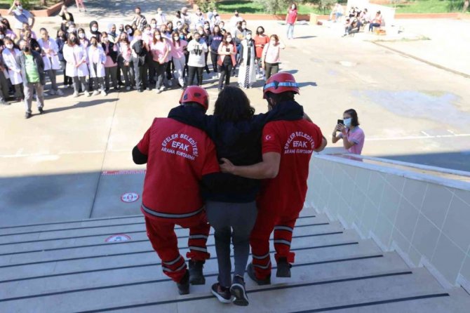 Efeler Belediyesi Arama Kurtarma Ekibi (EFAK), Murat-Hale Küçükoğlu Mesleki ve Teknik Anadolu Lisesi'nde öğrenciler ve öğretmenlerin de katıldığı deprem eğitimi ve tatbikatı gerçekleştirdi.