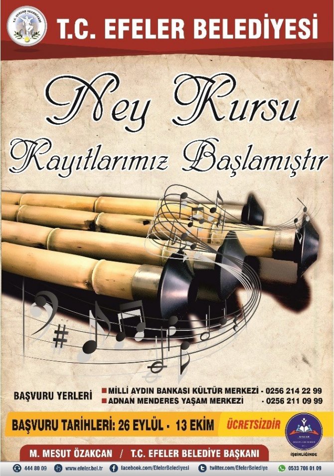 Efeler Belediyesi ve Efeler Halk Eğitim Merkezi iş birliği ile düzenlenecek olan kursta, ilçe halkı çıkardığı nağmeler ile kalplere dokunan neyi üflemeyi öğrenecek. Birçok dalda güz dönemi için kurs kayıtları alan Efeler Belediyesi, ilçe halkından gelen talep üzerine kurslara ney kursunu da ilave etti. Gelen taleplere duyarsız kalmayan Kültür ve Sosyal İşler Müdürlüğü, 26 Eylül Salı günü ney kursu için başlattığı kurs kayıtlarını 13 Ekim Cuma günü sonlandıracak. Kursa katılmak isteyen vatandaşlar, Efeler Belediyesi Milli Aydın Bankası Kültür Merkezi ile Adnan Menderes Mahallesi Yaşam Merkezi’ne başvuru yapabilecek.