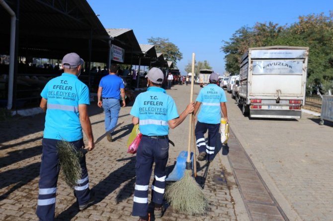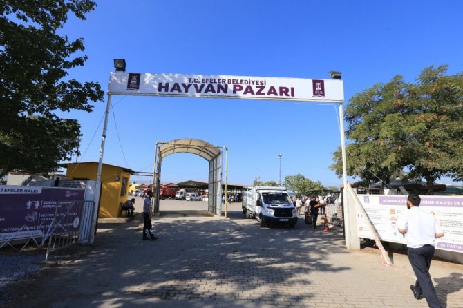 Efeler Belediyesi ekipleri, kentin en büyük hayvan pazarı olan Çeştepe Hayvan Pazarı'nda ve diğer tüm kurban kesim alanlarında sağlıklı, hijyenik ve güvenli koşullarda kurban kesiminin sağlanabilmesi için görev başındaydı. Efeler Belediyesi Veteriner İşleri Müdürlüğü'nde görevli veteriner hekimler ve personel tarafından Çeştepe Hayvan Pazarı'ndaki tüm kurbanlıkların kontrolü sağlıklı bir şekilde yapıldı. Hayvan pazarına araçlarıyla giriş yapan vatandaşların araçları Efeler Belediyesi Veteriner İşleri Müdürlüğü sorumluluğundaki dezenfeksiyon tünelinden geçirilerek, hijyenik ortamın kalıcılığı için dezenfekte edildi. Ayrıca kurbanlık giriş çıkışları da kontrol altına alındı. Zabıta Müdürlüğü ekipleri ile özel güvenlik görevlileri, yoğunluk nedeniyle bir olumsuzluk yaşanmaması için güvenliği sağladı. Temizlik İşleri Müdürlüğü ekipleri ise, kurban kesim alanlarındaki temizliği korumak için aralıksız çalıştı. Öte yandan Efeler Belediyesi'nin ikram araçları ile vatandaşlara ücretsiz su, çay, kahve ve soğuk meşrubat dağıtıldı.