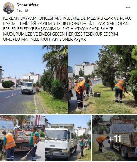 Çalışmalar için Efeler Belediye Başkanı Mehmet Fatih Atay'a yaptığı sosyal medya paylaşımı ile teşekkür eden Umurlu Mahalle Muhtarı Soner Afşar, "Yaklaşan Kurban Bayramı öncesinde Efeler Belediyesi ekiplerince, mahallemizde yabani ot temizliği çalışması yapılmıştır. Efeler Belediye Başkanımız Mehmet Fatih Atay'a, Park ve Bahçeler Müdürlüğümüze ve emeği geçen herkese teşekkür ederim" İfadelerini kullandı.