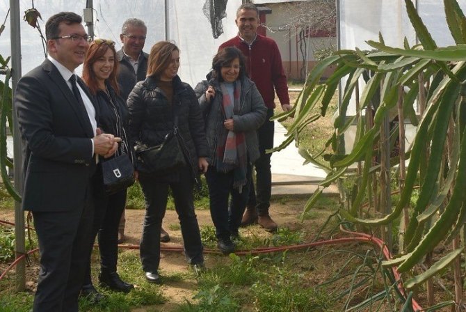 Efeler Kaymakamı Cemal Şahin ilçe genelinde ejder meyvesi olarak bilinen pitaya üretimi yapan çiftçileri seralarında ziyaret ederek sohbet etti.