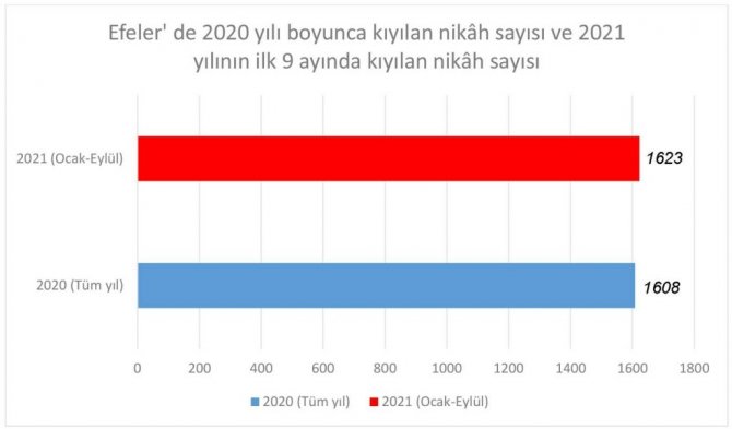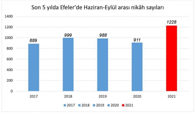 Efeler'de çiftler, pandemi nedeniyle alınan tedbirlere rağmen, evlenmek için en çok Haziran, Temmuz, Ağustos ve Eylül aylarını tercih etti. Paylaşılan veriler incelendiğinde düğün sezonu olarak bilinen Haziran - Eylül ayları arasında kıyılan nikâhlarda 2020 yılına göre yüzde 35'lik artış görüldü. Bu 4 aylık dönemde bin 228 çift hayatlarını birleştirirken 2020 yılındaki sayı 911 olarak kayıtlara geçmişti.