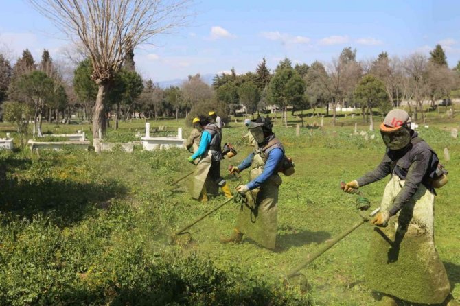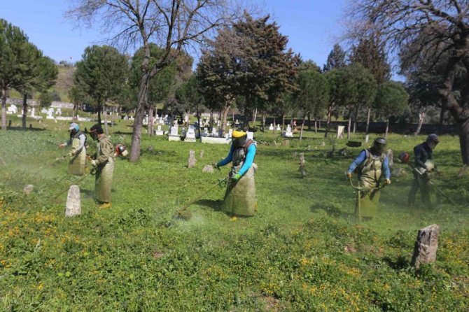 Efeler Belediyesi Mezarlıklar Müdürlüğü ekipleri, ilçe genelindeki 83 mahallede bulunan toplam 117 mezarlıkta gerçekleştirdiği bakım ve yabani ot temizliği çalışmalarına büyük bir hızla başladı.