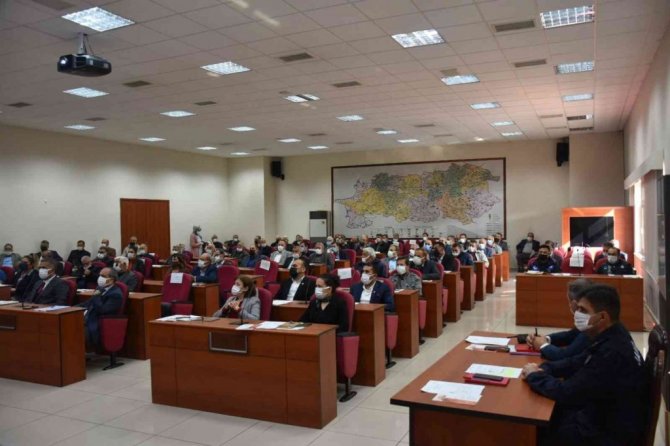 Efeler Kaymakamlığı Toplantı Salonu'nda gerçekleştirilen toplantıya, İlçe İdare Şube Başkanları ile köy ve mahalle muhtarları katıldı.