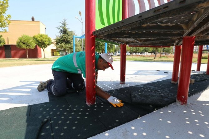 Vatandaşlardan gelen talep üzerine Ahi Evran Parkı'nın zeminine kauçuk kaplama yapan ekipler, oluşturulan yumuşak zemin ile çocukların daha güvenli şekilde zaman geçirip, oyun oynayabilmelerini sağlayacak. Yüksek derecelere ulaşan hava sıcaklığına rağmen Hakkı Uyar Parkı'nda gerçekleştirilen özverili çalışmada, mobil yıkama araçları kullanılarak oyun grupları ve zemin buharlı sularla yıkanırken park çevresi ile oturma alanları da temizlenerek Efeler halkının kullanımına sunuldu.