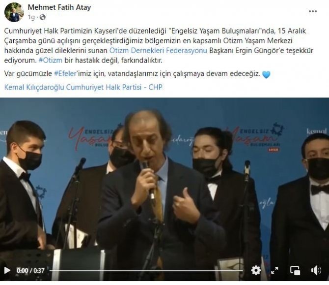 CHP tarafından Kayseri'de düzenlenen Engelsiz Yaşam Buluşması'nda konuşma yapan Otizm Dernekleri Federasyonu Başkanı Ergin Güngör, Efeler Belediye Başkanı Mehmet Fatih Atay'ın Efeler'e kazandırdığı Otizm Yaşam Merkezi'nden bahsederek, bu merkezin tüm belediyelere örnek olmasını diledi.