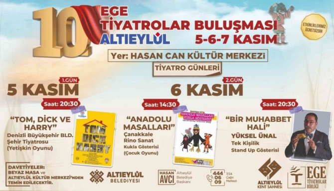 10. Ege Tiyatrolar Bululması'na ev sahipliği yapacak Altıeylül Belediye Başkan Hasan Avcı ise buluşma için, "Altıeylül Kent Sahnesi olarak ilk büyük organizasyonumuz ile perdelerimizi açıyoruz. 5-6-7 Kasım'da Ege'li Tiyatrolar Altıeylül'de Buluşuyor. 55 Tiyatro Temsilcisi'nin Genel Sanat Yönetmeni, Türkiye'nin farklı bölgelerinden gelen Tiyatro ustaları, oyun yazarları, akademisyenleri konuk edeceğiz. Ege Tiyatrolar Birliği'nin 10. büyük buluşması, 10 plakalı şehrimizin merkez ilçesi Altıeylül'de gerçekleşiyor. Üç gün boyunca tiyatro gösterileri, söyleşiler, atölyeler, çocuk tiyatroları ile kentimizin her köşesinde sanata doyacak, tiyatronun ustalarını kentimizde ağırlayacak ve şehrimizi tanıtacağız. Kapalı ve açık oturumların olduğu bu büyük buluşmada siz değerli sanatseverlerimizle tiyatro sanatçılarımızı buluşturacağız" ifadelerini kullandı.