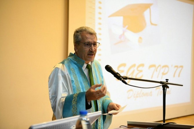 Ege Üniversitesi Tıp Fakültesi Dekanı Prof. Dr. Cemil Gürgün “1977 yılı ülkemiz için sıkıntılı bir süreçti. Bu sürecin uzantısı olarak yapılamayan mezuniyet töreni için 40 yıl sonra bir araya geldik. Günümüzde tıp eğitimi için en büyük korkumuz teknoloji. Çünkü giderek makineleşerek insanlardan uzaklaşıyoruz. Ancak biz bilgisayarın tuşuna değil insanların yüreğine dokunacak doktorlar yetiştirmek istiyoruz. Atatürk’ün ‘Cumhuriyet sizden fikri hür vicdanı hür irfanı hür nesiller ister’ sözünde dediği gibi biz de böyle hekimler yetiştirmeye devam ediyoruz” diye konuştu.