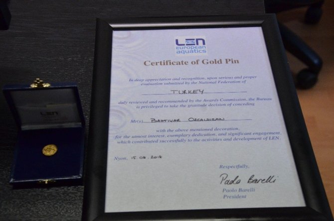 Türkiye Yüzme Federasyonunda; yönetim kurulu üyeliği, milli takım antrenörlüğü, eğitim kurulu başkanlığı, idareci ve daha birçok konuda görev ve sorumluluk üstlenen Prof. Dr. Bahtiyar Özçaldıran, yıllar süren bir çalışmanın karşılığında verilen “Altın Rozet” ödülü ile ilgili “40 yıllık yüzme yaşantımın 35 yılında Yüzme Federasyonunda çalıştım. Bu sürenin 20 yılında Avrupa Yüzme Federasyonu’nun farklı farklı organizasyonları ve çalışmalarında görev yaptım. Bunun sonucunda yaptığım hizmetler ve görevlerdeki başarılarımdan dolayı Avrupa’da LEN’in verebileceği en büyük onur ödülüne layık görüldüm. Onur verici bir durum. Beni bu günlere getiren hocalarımın, Türkiye Yüzme Federasyonu’nun her dönemdeki başkanlarının büyük payı var. Hepsine çok teşekkür ediyorum. Ülke bayrağını dalgalandırmak için yarıştım. Batı’nın yapamaz dediklerini yapmak için çabaladım. Bir Türk çocuğunun bir Türk hocasının neleri başarabileceğini ispatladım. Bundan hiçbir maddi menfaat elde etmedim. Yaptığım her şeyi ülkem adına yaptım. Onur ve gurur duymak için çaba sarf ettim. Bir Avrupa Şampiyonası’nda Başhakem sen olduğun zaman Türk Bayrağı orada en üstte dalgalanıyor. Bu bizim için en büyük, en zengin ödül oldu. İnsanların emeğimizin karşılığını takdir edip ödül vermeleri beni ayrıca gururlandırdı” dedi.