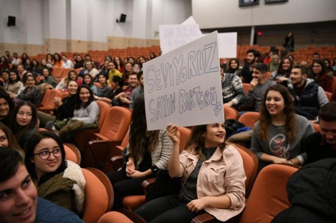 Prof. Dr. Budak, sürpriz buluşmada emeği geçen herkese teşekkür ederken öğrencilere Ege Üniversitesi kalem ve anahtarlıklarını bizzat kendisi dağıttı. Öğrencilerle akademik personelin ve rektörün sürekli iletişim halinde olmasının öneminin altını çizen Budak, “Biz sizler için buradayız. Bize istediğiniz zaman ulaşabilirsiniz” diye konuştu.