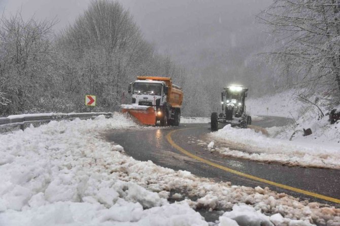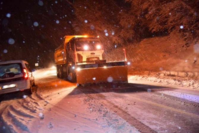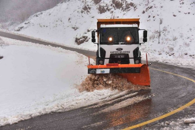Kar yağışının etkisini sürdüğü Kartepe'de, ekipler yolu açık tutabilmek için mücadele ediyor.