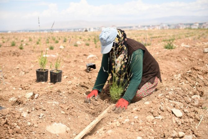 Kahramanmaraş'ın Elbistan ilçesinde Türkiye'nin en büyük lavanta vadisini oluşturma projesinin 3.etabında 15 bin fide daha toprakla buluşturuldu.