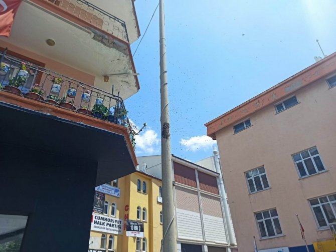Konya'nın Seydişehir ilçesinde en işlek caddede bulunan elektrik direğine oğul veren arılar, çağrılan aracı tarafından toplandı.