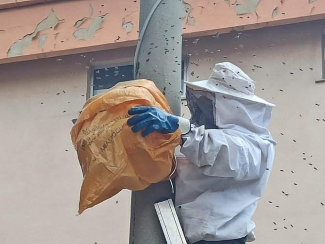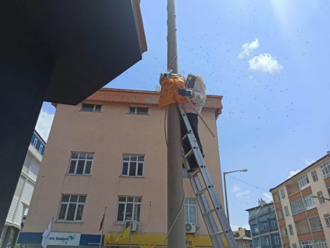 Elektrik direğine oğul veren arılar kovana alındı