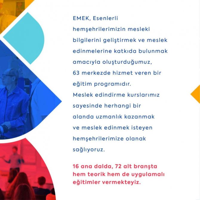 Esenler Belediyesi, 16 alan ve 72 branşta ilçe sakinlerinin mesleki bilgilerini geliştirmek ve gelir elde etmelerine katkıda bulunmak amacıyla EMEK (Esenler Meslek Edindirme Kursları)'i hizmete sunuyor. Kursiyerlerin uzmanlık kazanarak iş bulması ve kendi iş yerlerini açabilmesini kolaylaştıracak EMEK'e başvurular, belediyenin internet sitesi üzerinden yapılabiliyor. Ayrıca EMEK'e başvurmak isteyenler ders başlangıç tarihi olan 3 Ocak 2022'de kimlik kartı fotokopileri ile kurs merkezlerinde form doldurarak kesin kayıtlarını gerçekleştirebilecekler.