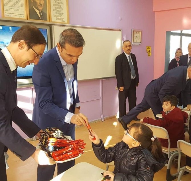 Kaymakam Çiçek, kitap okuma etkinliğine katılan öğrencilere, kitap okuyarak çok güzel, çok faydalı bir etkinliği yerine getirdiklerini, kitap okumayı sevmelerini ve alışkanlık haline getirmelerini öğütleyerek, Okul Müdürü İsmail Tavacı ile birlikte çikolata ikramında bulundu.
