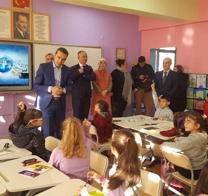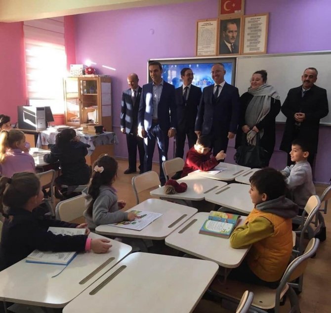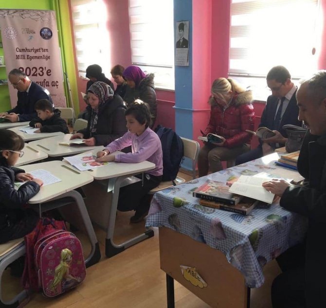 Kaymakam Çiçek ve beraberindekiler, 2-A sınıfında öğrencilerle bir araya gelerek 15 dakika boyunca kitap okudular.