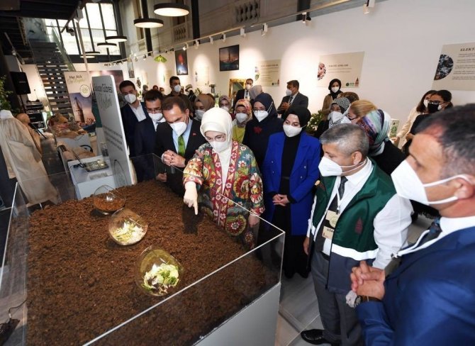 TBMM Başkanı Mustafa Şentop'un eşi Sabriye Şentop ile Beyoğlu Belediyesi Sanat Galerisi'nde, toplanan atık malzemelerden üretilen ürünlerin yer aldığı serginin açılışını gerçekleştiren Erdoğan, daha sonra Şişhane Meydanı'nda kurulan geri dönüşüm stantlarını gezdi.