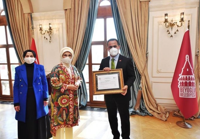Emine Erdoğan, "Sıfır Atık" belgesini Beyoğlu Belediye Başkanı Haydar Ali Yıldız'a verdi. Erdoğan, Beyoğlu Belediyesinin Anı Defteri'ni de imzaladı.